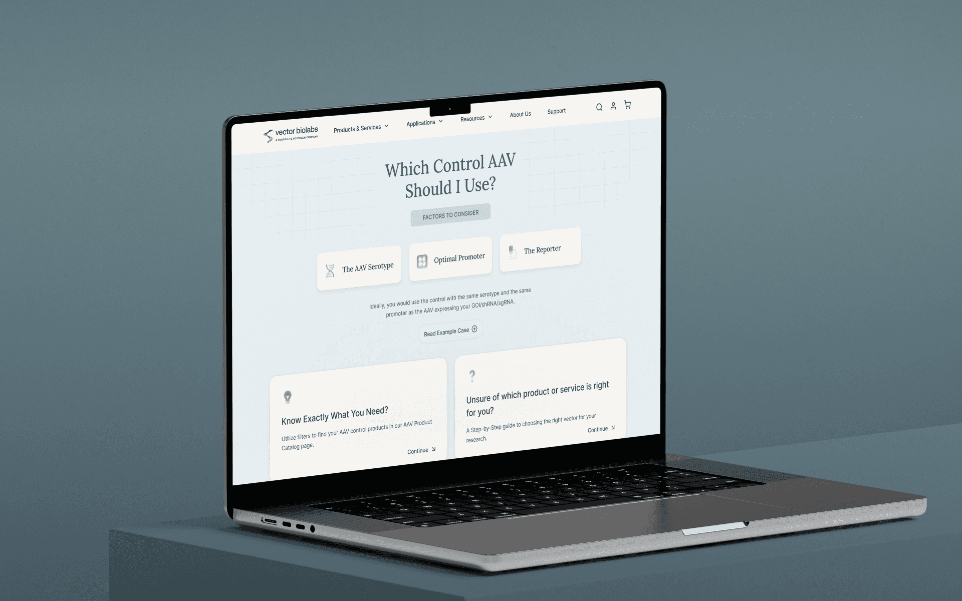 One of the most content-critical pages of the site, designed to guide researchers through complex decision trees with clarity and ease. This visual framework balances scientific precision with approachability, helping users choose the right AAV control through structured content, clean hierarchy, and intuitive layout.