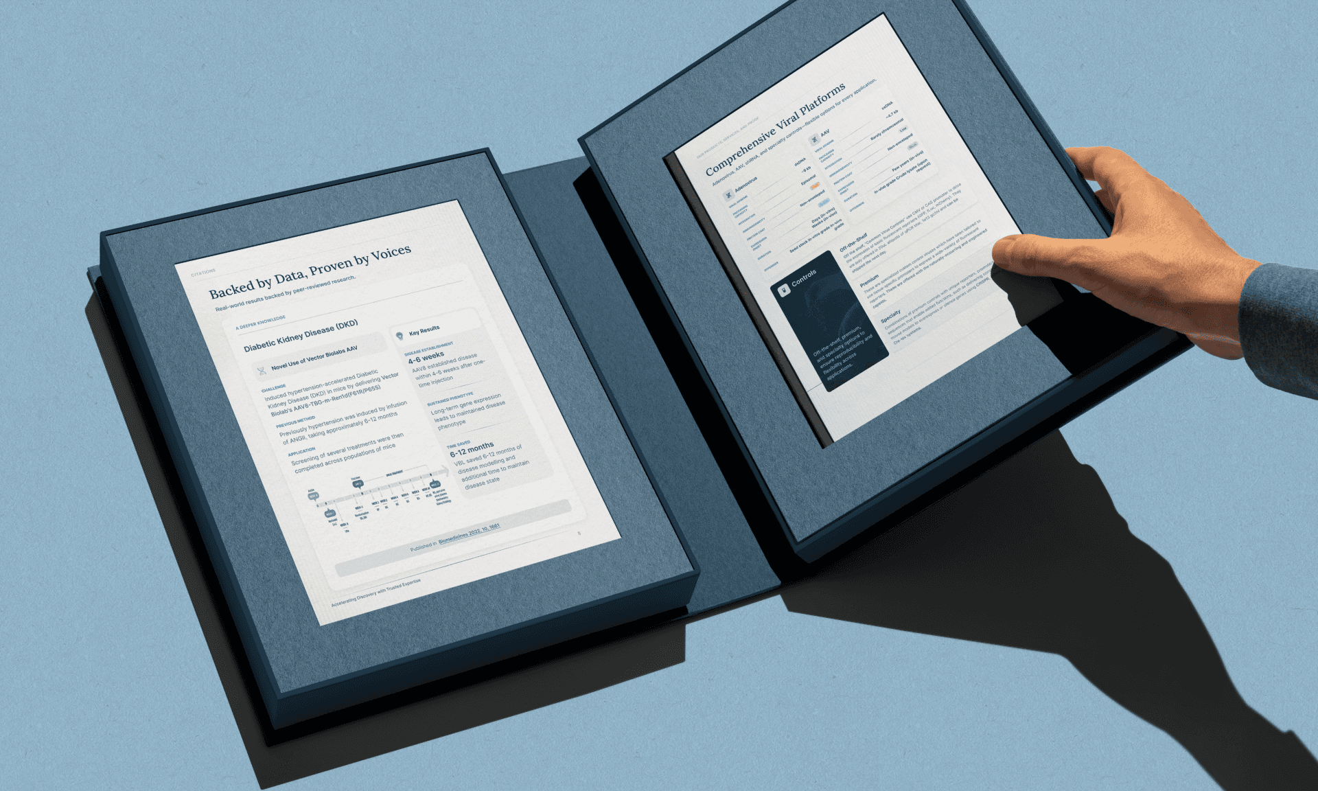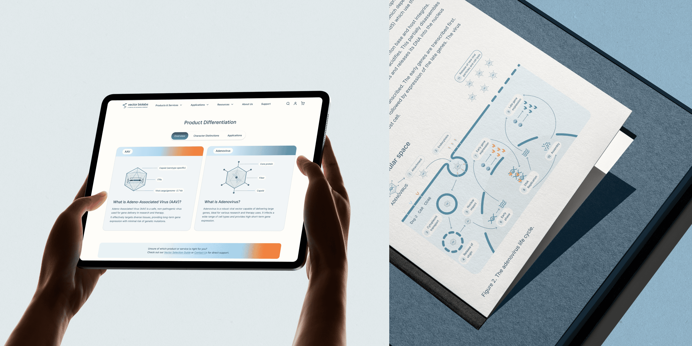 Selected website design screens showcasing how we translated complex gene therapy content into intuitive, visually elegant layouts. The interface blends clarity and credibility, balancing scientific data, product comparisons, and application use cases into a seamless user experience that builds trust across diverse audiences.